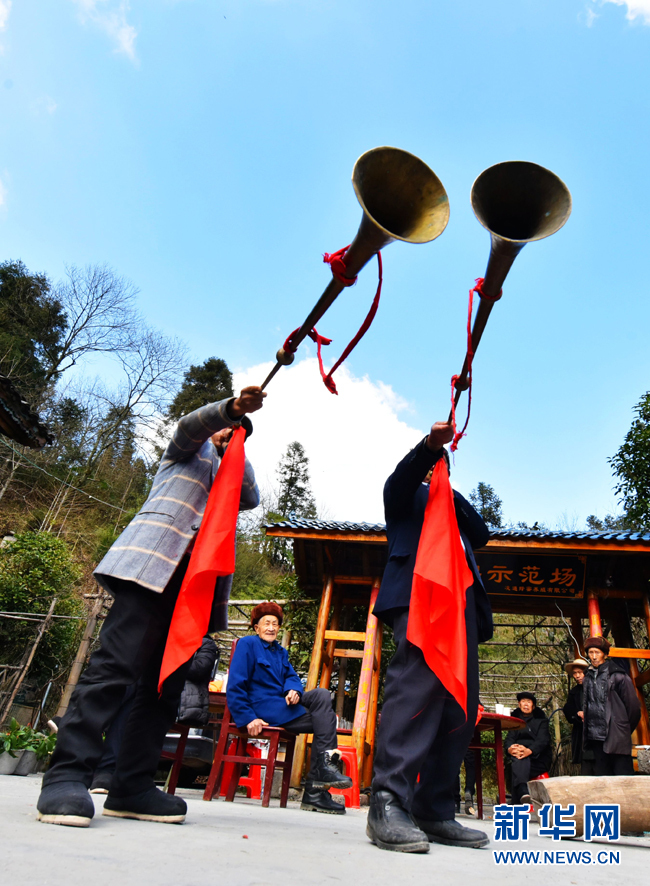 图为当地村民表演土家族吹大号。新华网发(陈碧生 摄)