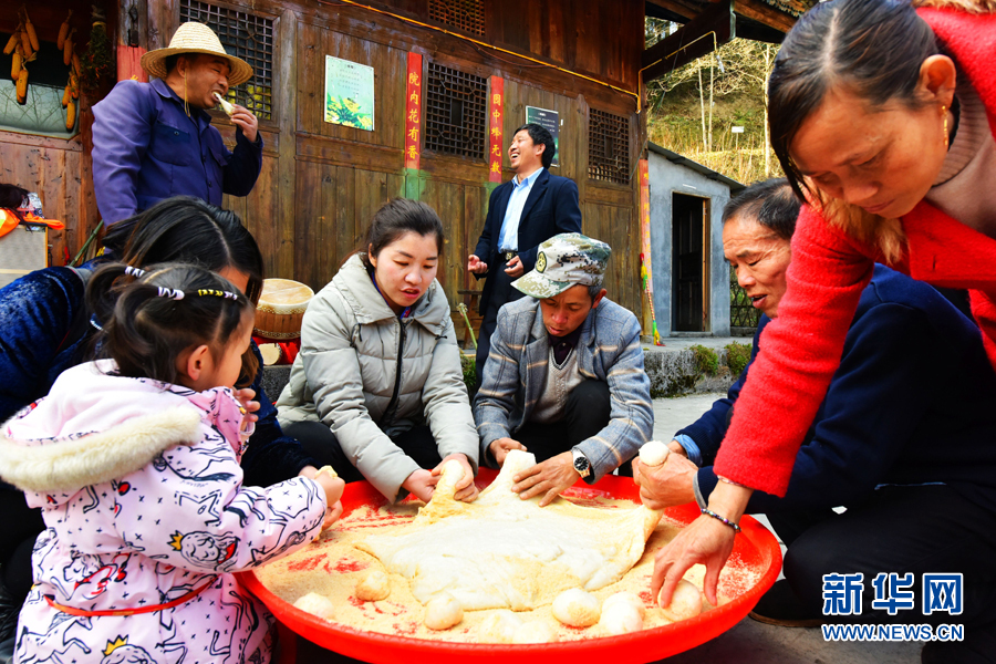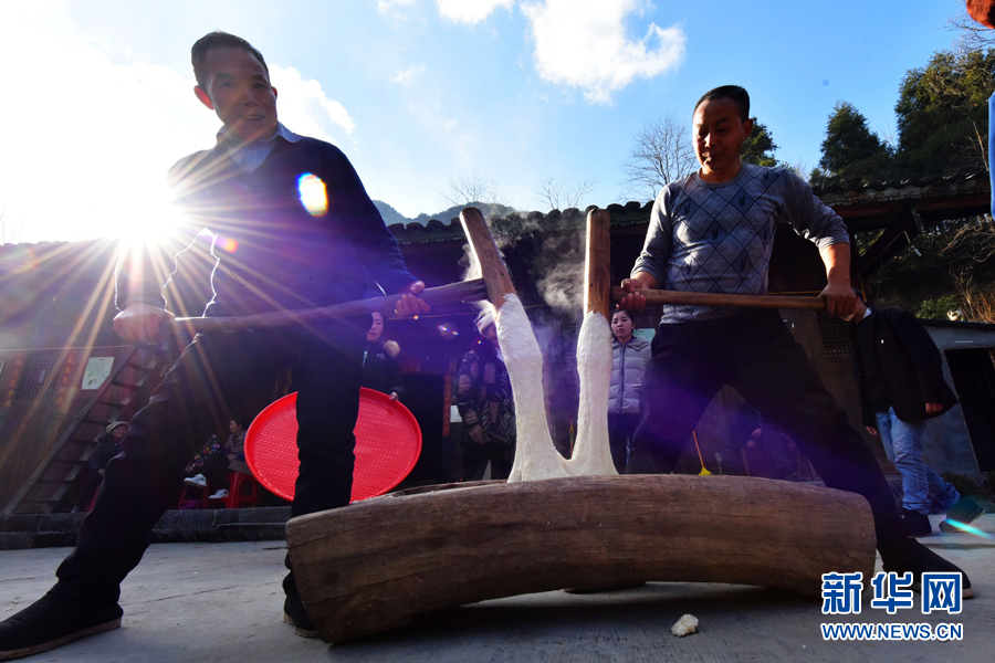 图为村民们在一起打糍粑。新华网发(陈碧生 摄)