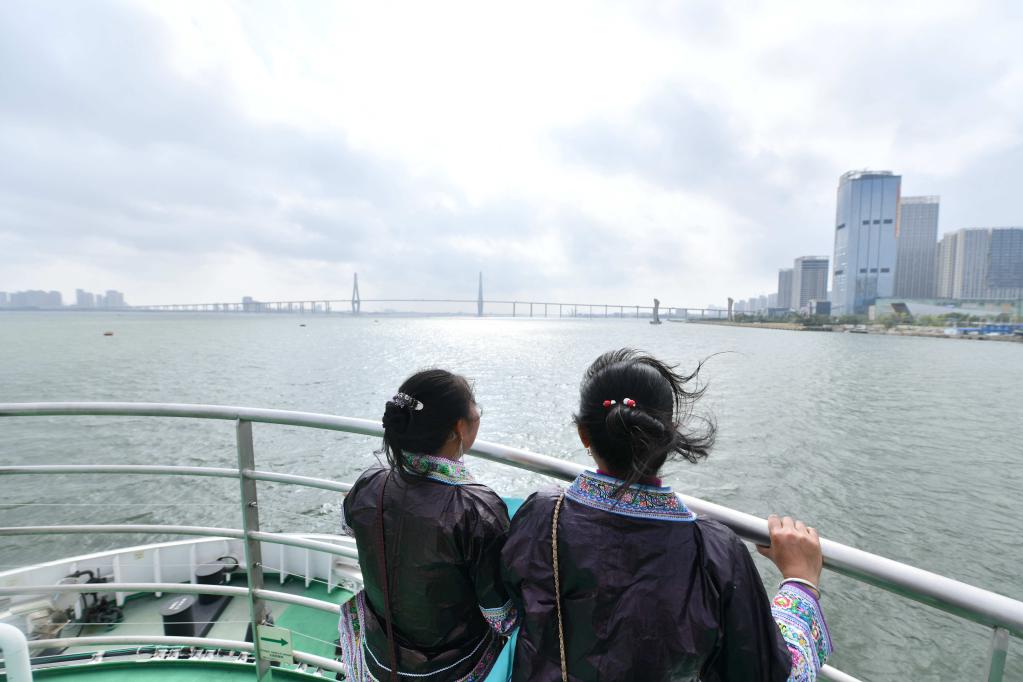 在广东廉江市近海海域的游船上,来自广西融水苗族自治县杆洞乡党鸠村乌英苗寨的妇女梁足英(左)和吴妹富在欣赏海景(2021年11月4日摄)。在廉江市爱心人士的支持下,她们第一次走出大苗山参观学习。 新华社发(覃天阳 摄)
