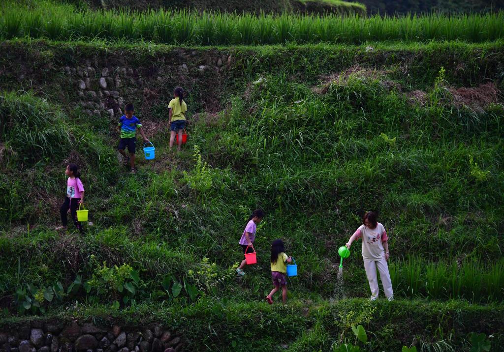 大学生潘木枝(右一)带着小学生给树苗浇水(2021年7月14日摄)。新华社记者 黄孝邦 摄