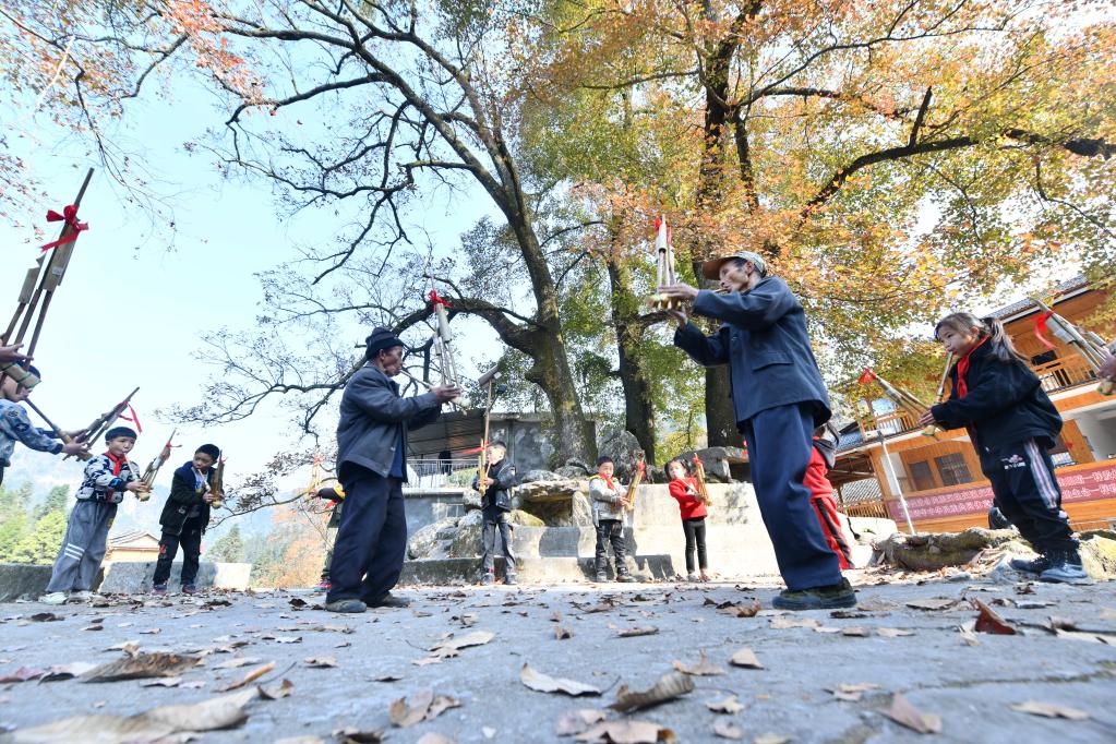 老年志愿者教授孩子们芦笙技艺(2021年12月29日摄)。新华社记者 黄孝邦 摄