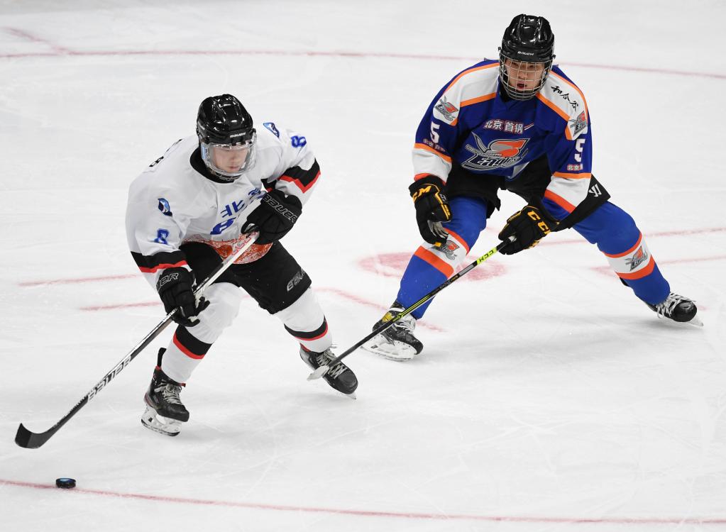 2021年11月13日,北京极狐队球员左天佑(左)与北京首钢队球员徐涵雍在比赛中拼抢。新华社记者张晨霖摄