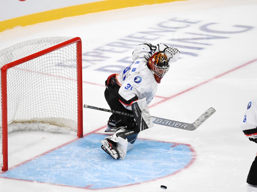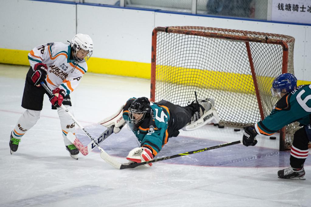 2021年12月24日,杭州一冰球队队员包盛杰(中)在队内对抗赛中扑救。新华社记者江汉摄