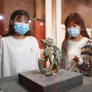2022年1月10日,观众在张家口市崇礼区太子城遗址陈列馆欣赏太子城遗址出土的铜坐龙。新华社发(武殿森摄)