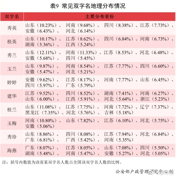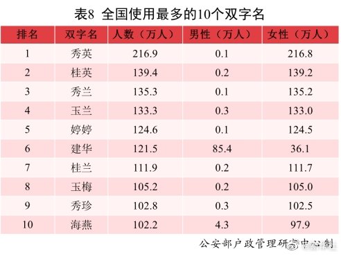 公安部户政管理研究中心24日发布2021年全国姓名报告。全国户籍人口中,使用频率最高的10个双字名依次为:秀英、桂英、秀兰、玉兰、婷婷、建华、桂兰、玉梅、秀珍、海燕。其中“秀英”名列榜首,使用人数为216.9万。男性使用较多的双字名仅有“建华”;其余常见双字名为女性使用较多,重名率明显高于男性。5.24%的“桂英”分布在江西;5.79%的“婷婷”、6.81%的“秀珍”、8.07%的“海燕”分布在广东;5.91%、5.23%的“建华”分布在江西和浙江;7.37%、7.35%、5.18%的“桂兰”分布在辽宁、黑龙江和吉林;5.42%的“秀珍”分布在广西。(记者熊丰)
