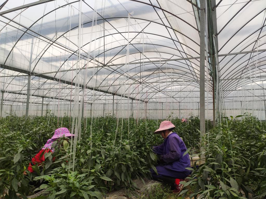 瑞金九丰农业科技园的蔬菜大棚内工人正在采摘辣椒。新华社记者 姚子云摄
