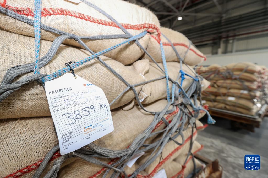 这张纸质标签系在一托盘麻袋包的捆扎绳上,标签上还有航班号、相关航空公司的英文名称以及飞离喀布尔机场的时间等信息。类似的十余个托盘,静静停放在浦东国际机场的一间货站中,接受身穿防护服的中国海关关员检疫查验。