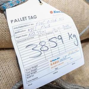 “KBL-PVG”“3859KG”——这是手工书写在一张商品标签上的字母和数字,意思是“喀布尔机场-浦东机场”“3859千克”。