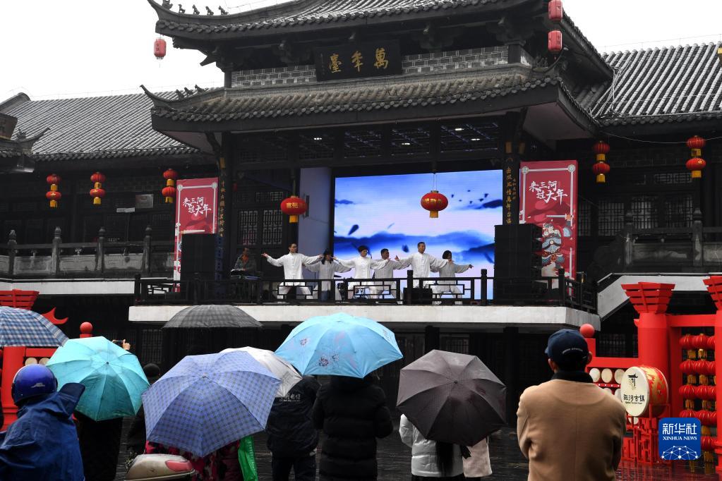 1月24日,民间团体在合肥市肥西县三河古镇表演太极拳。