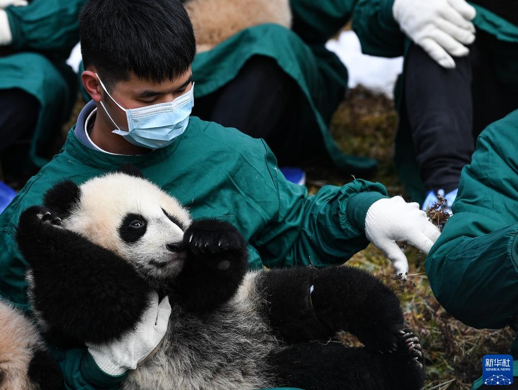 1月24日,在中国大熊猫保护研究中心卧龙神树坪基地,工作人员抱着熊猫宝宝亮相。新华社记者 王曦 摄