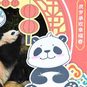 熊猫运动场内一派喜气,树上的红灯笼、门上的红对联、地上的“鞭炮”和“新年礼物盒”,营造了浓浓的春节氛围。20名奶爸奶妈每人怀抱一只熊猫宝宝闪亮登场,齐声祝福全国人民:新春快乐,虎虎生威。