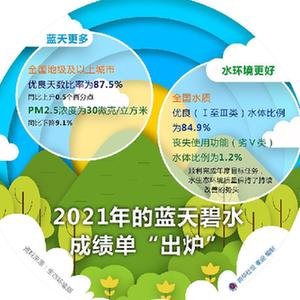 水环境更好。生态环境部总工程师、水生态环境司司长张波介绍,2021年,全国水质优良(Ⅰ至Ⅲ类)水体比例为84.9%,丧失使用功能(劣Ⅴ类)水体比例为1.2%,顺利完成年度目标任务,水生态环境质量保持了持续改善的势头。