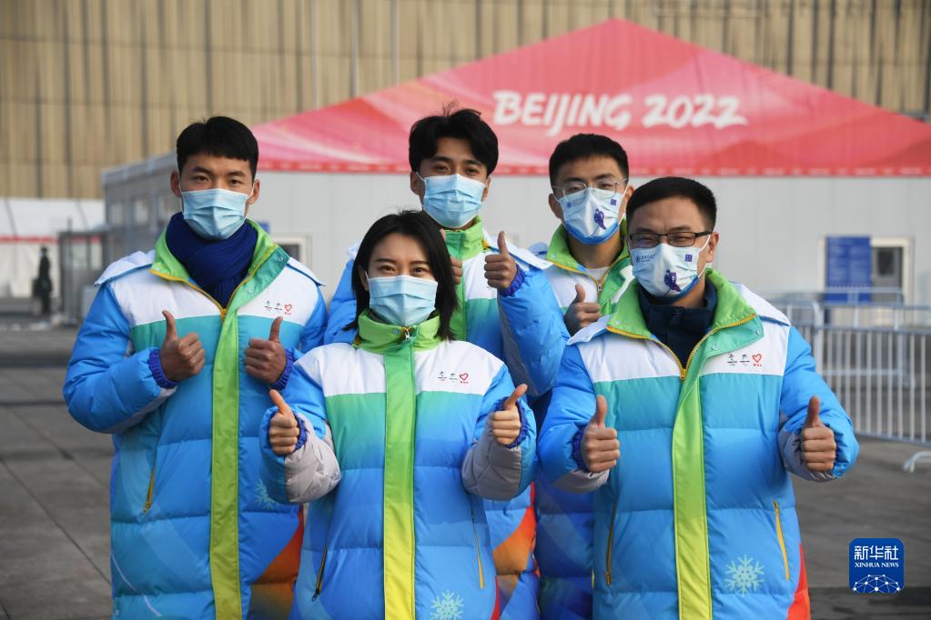 1月25日,城市志愿者代表在五棵松体育中心附近合影。