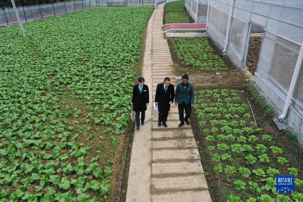 1月20日,中国农业银行重庆武隆支行“三农”客户经理傅小康(中)和同事一起,在武隆区双河镇石坝村了解蔬菜种植户的生产经营计划及资金需求(无人机照片)。新华社记者 王全超 摄