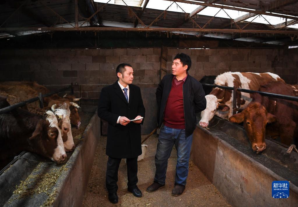1月20日,中国农业银行重庆武隆支行“三农”客户经理傅小康(左)在武隆区双河镇石坝村了解肉牛养殖户的生产经营计划及资金需求。新华社记者 王全超 摄