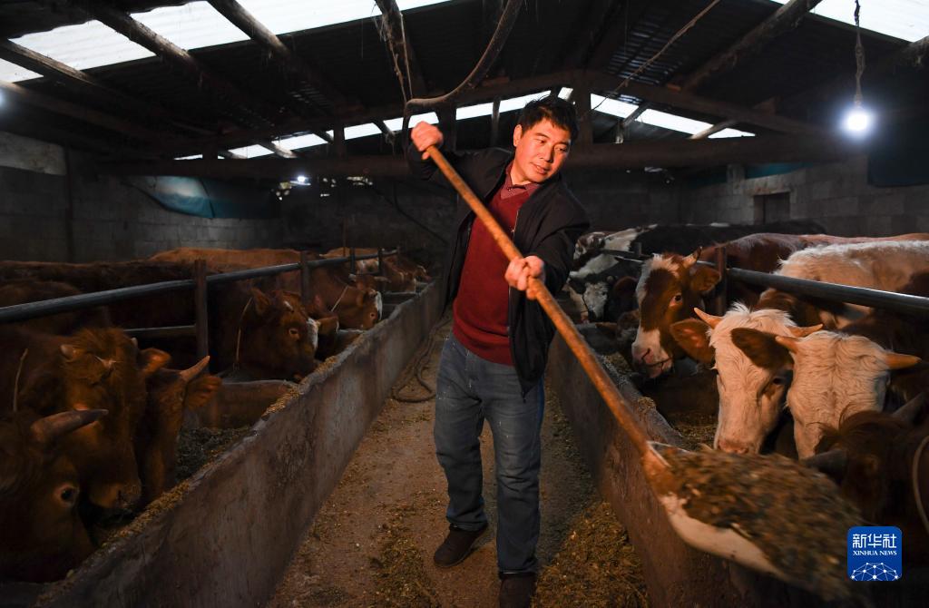 1月20日,武隆区双河镇石坝村村民贺友南在给牛喂食。新华社记者 王全超 摄