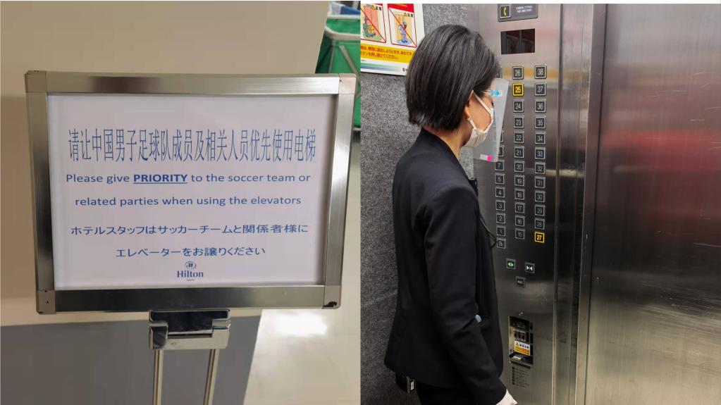 电梯无法做到24小时专用。由球队每日向酒店提出电梯使用计划,在固定时段使用电梯,每次使用均由酒店员工(当日抗原检测结果呈阴性)佩戴全套防护设备进行操作,避免球队人员直接触碰电梯按键。每一次记者下意识想要去按电梯,都会有工作人员提醒。