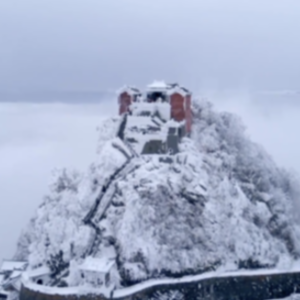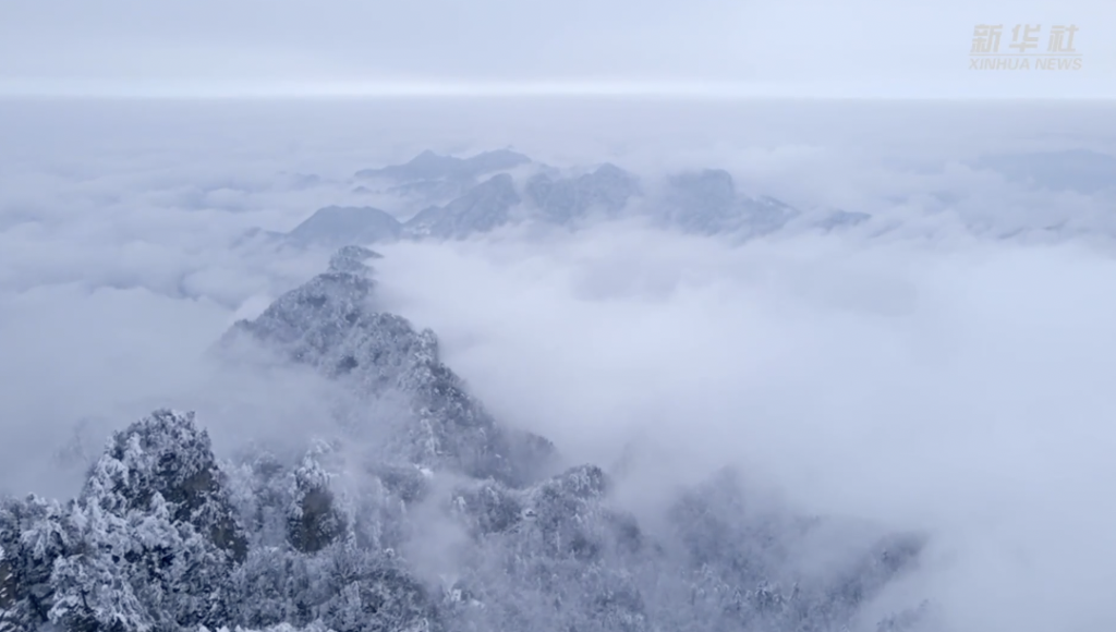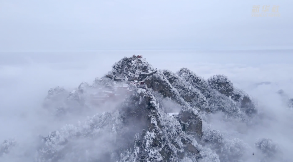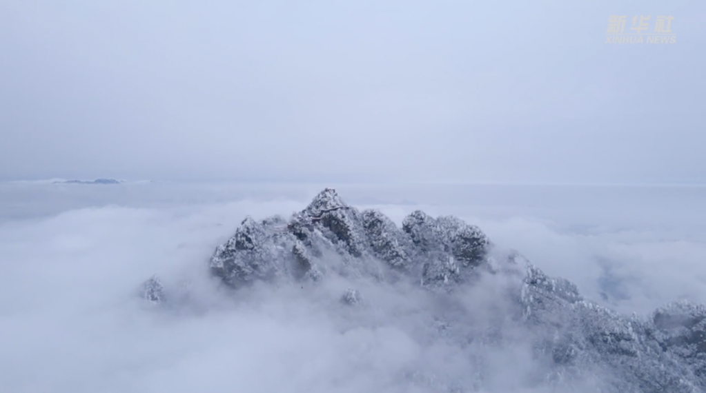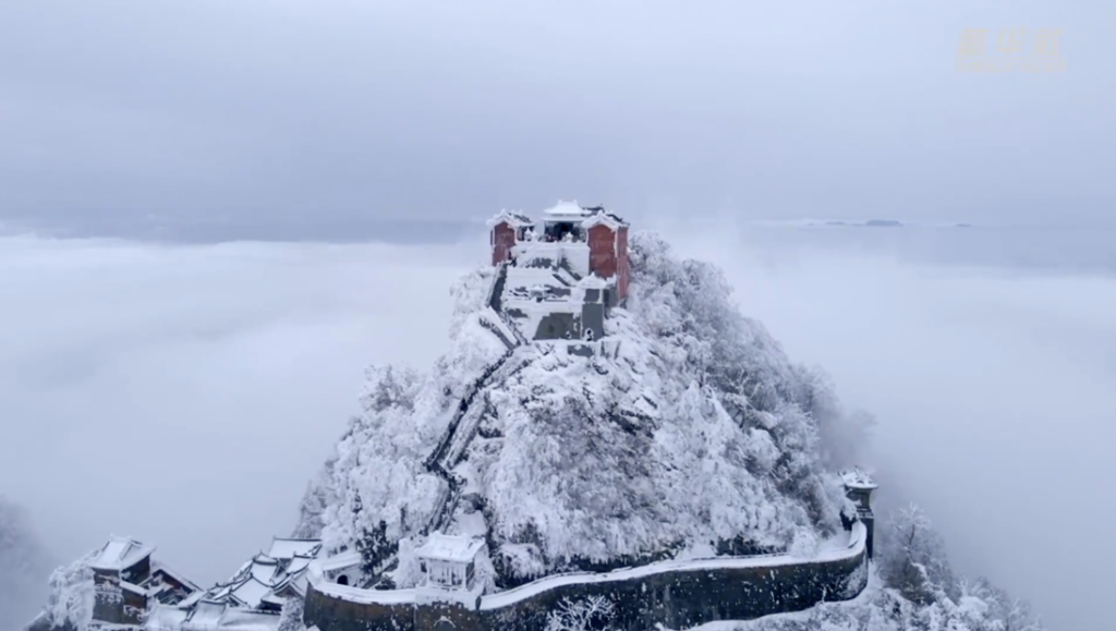 一场冬雪过后天色放晴,航拍中的湖北十堰武当山如梦如幻,银装素裹似“仙宫”,玉树琼花随处可见,让人在云巅仙境之中流连忘返。