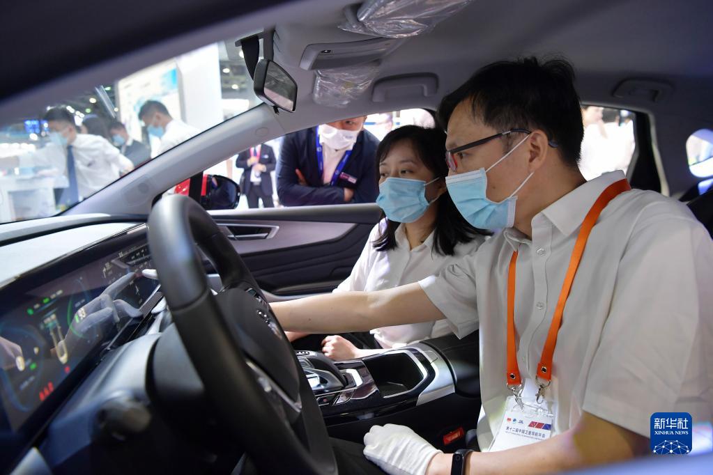 观众在第十二届中国卫星导航成就博览会上参观体验基于北斗卫星导航系统应用的电动车(2021年5月26日摄)。新华社记者 彭昭之 摄