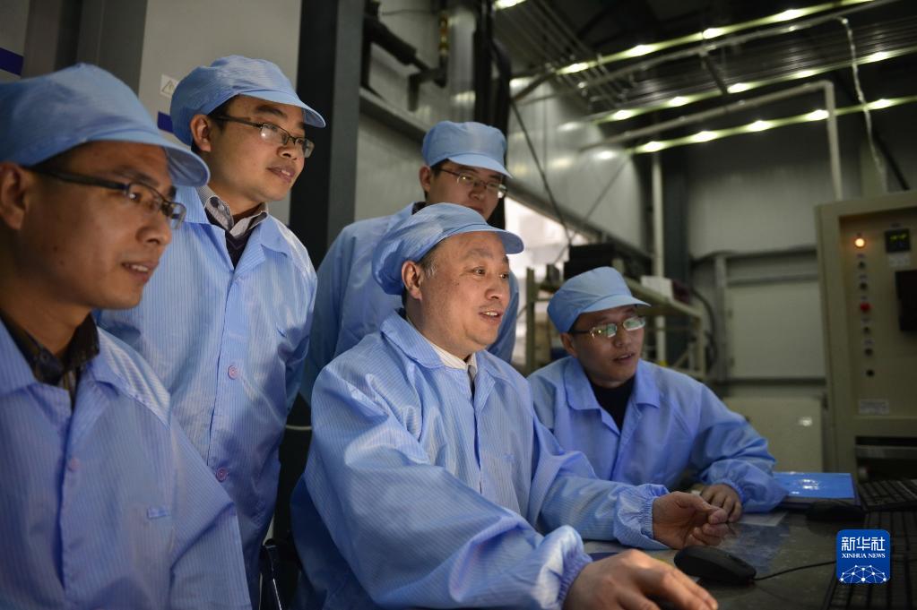南昌大学教授江风益(前中)和团队成员探讨硅衬底LED技术课题(2015年12月29日摄)。新华社记者 周密 摄