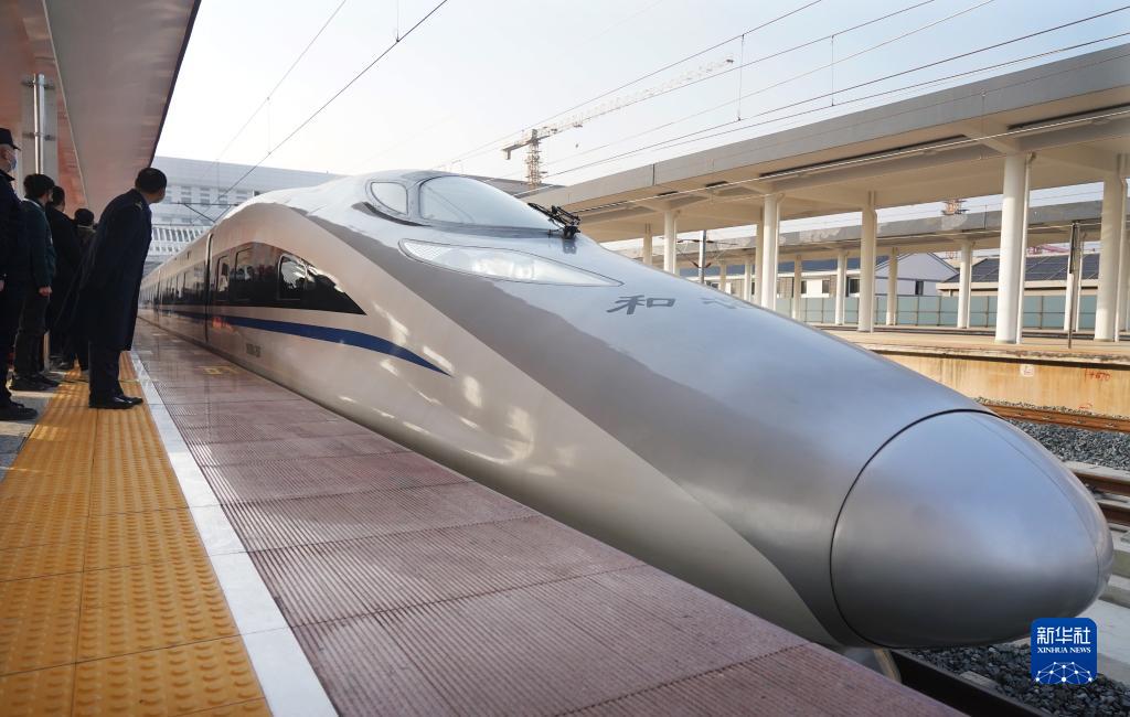 高铁G4660次列车从安九高铁庐山站内驶出。当日,安九高铁正式开通运营(2021年12月30日摄)。新华社记者 万象 摄