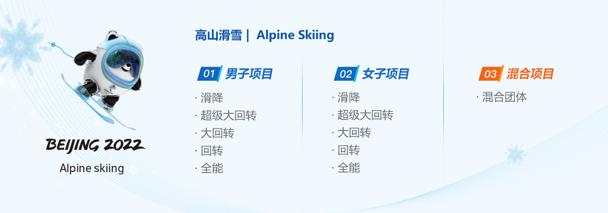 女子项目:滑降(DH)、超级大回转(SG)、大回转(GS)、回转(SL)、全能(AC)