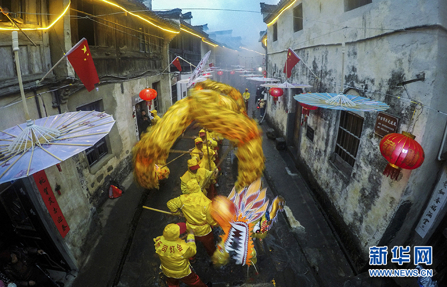 1月25日,龙灯队在安徽省宁国市胡乐镇胡乐村走街串巷。