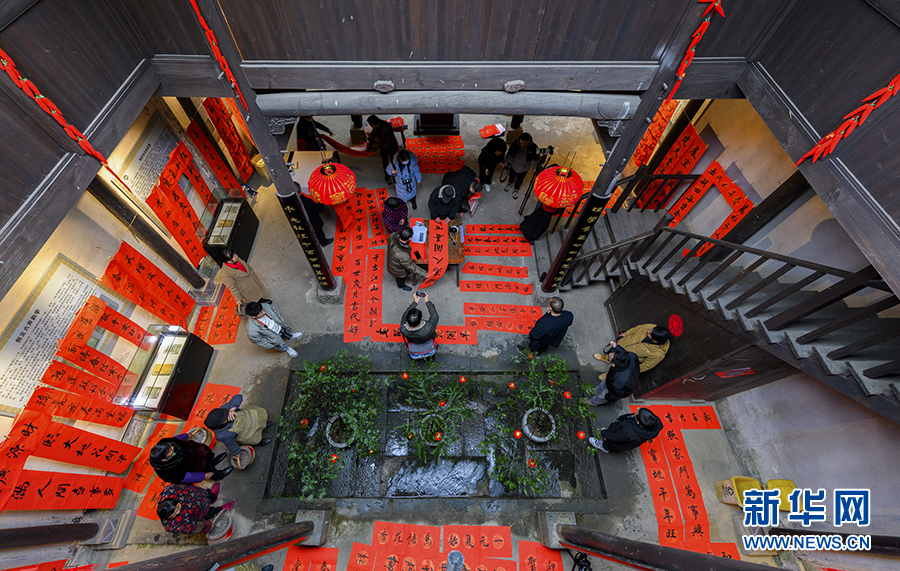 1月25日,在安徽省宁国胡乐镇胡乐村,文艺工作者免费为当地居民写春联、拍全家福。