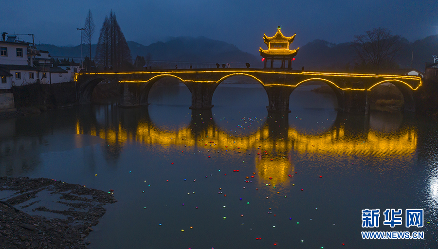 1月24日,在安徽省宁国市胡乐镇胡乐村廉夫桥下,胡乐老街居民点亮千盏河灯祈福。