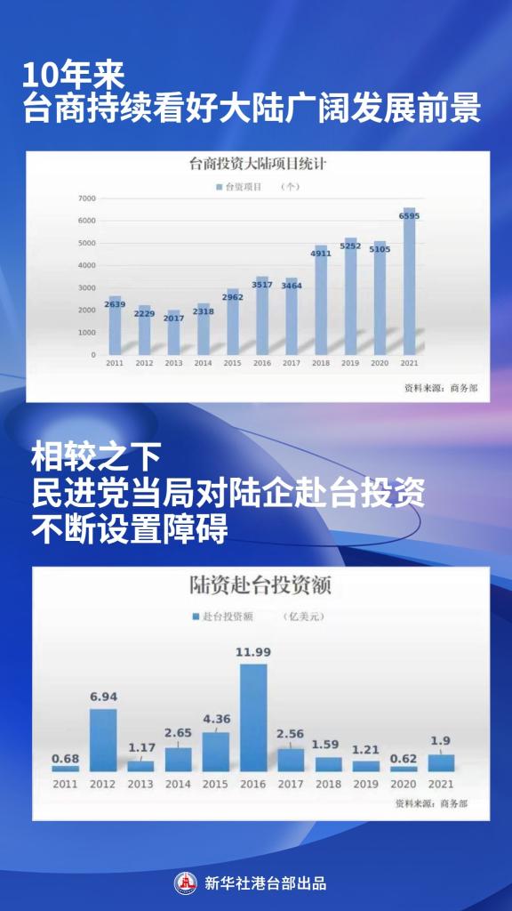 台商对大陆投资稳定增长。据商务部统计,2011年共批准台商投资大陆项目2639个,2021年为6595个。截至2021年底,台商投资大陆项目共计123781个,实际投资额713.4亿美元。10年来,新批准台资项目数、吸引台资金额稳定增加,充分表明台商持续看好大陆巨大内需市场、完备产业体系、强大生产制造能力和广阔发展前景。相较之下,由于民进党当局对大陆企业赴台投资不断设置新障碍,截至2021年底,陆资赴台投资额小幅增长,总额仅37.1亿美元。