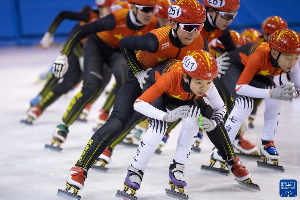 图为在七台河体育中心,七台河职业学院短道速滑训练中心的孩子们在进行训练(1月10日摄)。