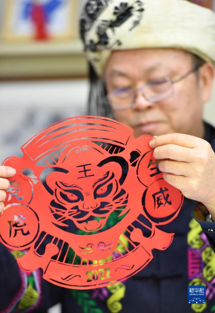 1月26日,在位于湖南省湘西土家族苗族自治州泸溪县的工作室中,“踏虎凿花”州级传承人李铁骑在展示作品。