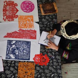 “踏虎凿花”因起源于湖南省湘西土家族苗族自治州泸溪县踏虎村、用刻刀在蜡板上以彩纸凿出不同图案而得名,被称为“不用剪刀的剪纸艺术”,最初用于苗族服饰上的纹样蓝本,而后逐渐演变为当地独具特色的少数民族民间传统手工艺品,创作主题不断丰富,刀法技艺日趋复杂。2008年,“踏虎凿花”被列入国家级非物质文化遗产扩展项目名录。
