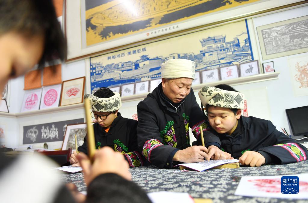 1月23日,“踏虎凿花”省级传承人杨桂军在位于湖南省湘西土家族苗族自治州泸溪县的踏虎凿花传习所中指导学生创作。