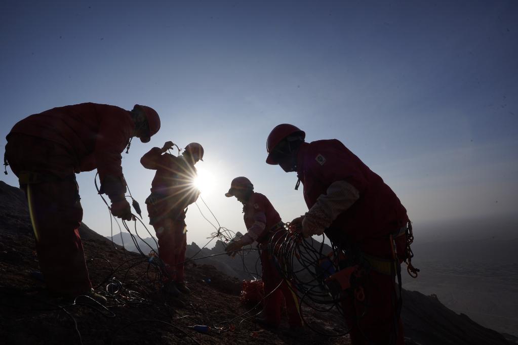 东方物探塔里木物探处247队工人在麻扎塔格山上收线作业。新华社记者 宿传义 摄