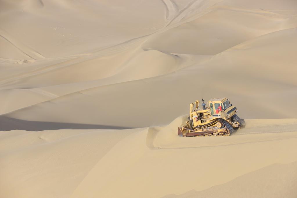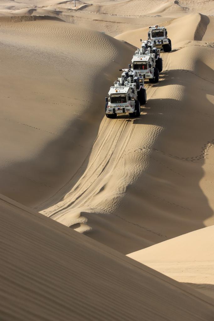 东方物探塔里木物探处247队震源车在沙漠中采集作业。王健 摄