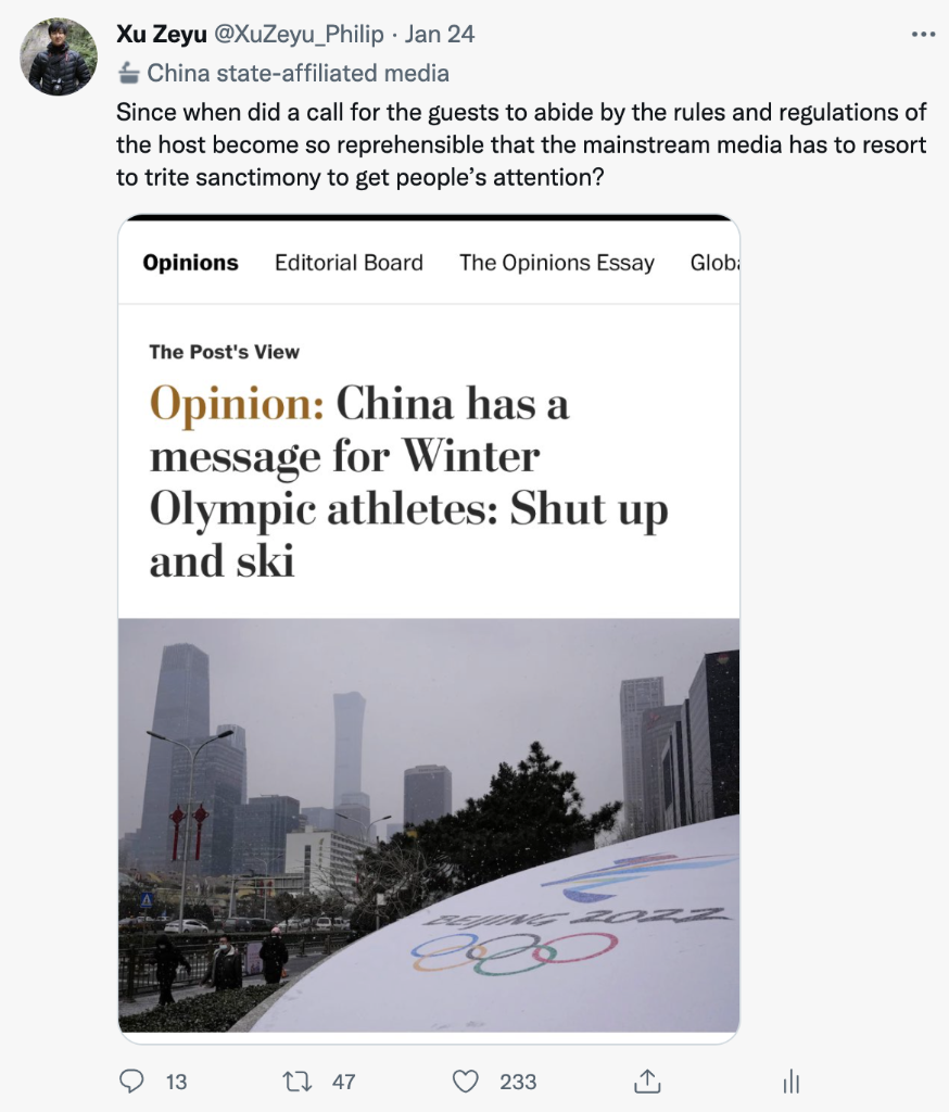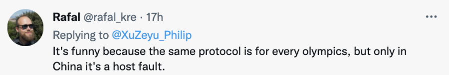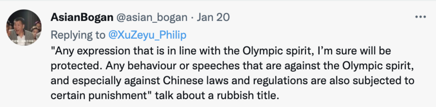 为此,新华社记者徐泽宇在推特上质问这篇报道:“难道提醒运动员坚持奥林匹克精神和遵守当地法律法规也有错吗?”