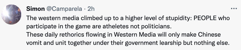 一名叫作Simon的网友指出外媒的这种不实报道只会起到适得其反的效果:“西方媒体的愚蠢再次登峰造极,别忘了,参加冬奥会的人是运动员而不是政客。这些言论只会使中国人在政府的领导下更加团结。”