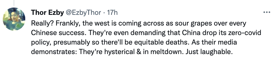 更有网友一针见血:“说实话,西方嫉妒中国取得的每一个成功。他们甚至要求中国取消‘清零’政策,其险恶用心昭然若揭。正如他们的媒体所表现出的歇斯底里一样,西方目前的状况是可笑至极的。”