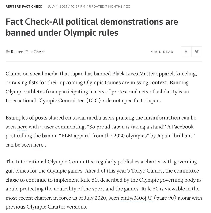 遵守《奥林匹克宪章》和当地法律法规,历来是每一位参赛选手的责任和义务,这本来就是一件毫无争议的事情。去年,路透社在一篇报道中为日本禁止运动员在东京奥运会期间宣扬政治观点的做法进行辩护,称这种禁令并非只有日本实行,而是国际奥委会一以贯之的规定。这篇报道还特意指出,国际奥委会在东京奥运会前决定继续实行奥林匹克宪章第50条,以此维持体育运动的中立性。