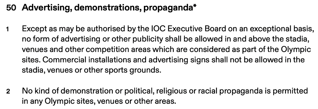 《奥林匹克宪章》第50条第二款规定,“不允许在任何奥运会地点、比赛场馆或其他奥运区域宣扬政治、宗教或种族观点”。