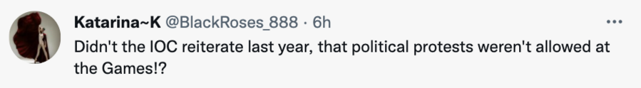一名海外网友在留言中呼应了《奥林匹克宪章》的规定:“国际奥委会不是在去年重申过赛会上不允许政治示威吗?”