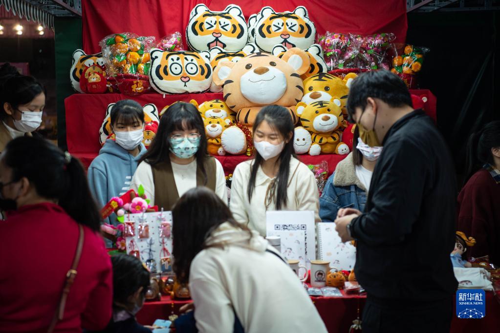 在塔石广场举办的农历春节年宵市场,澳门旅游学院的学生梁铠莹和王力杰当起了“摊主”,售卖老虎公仔、钥匙扣等各种文创产品。