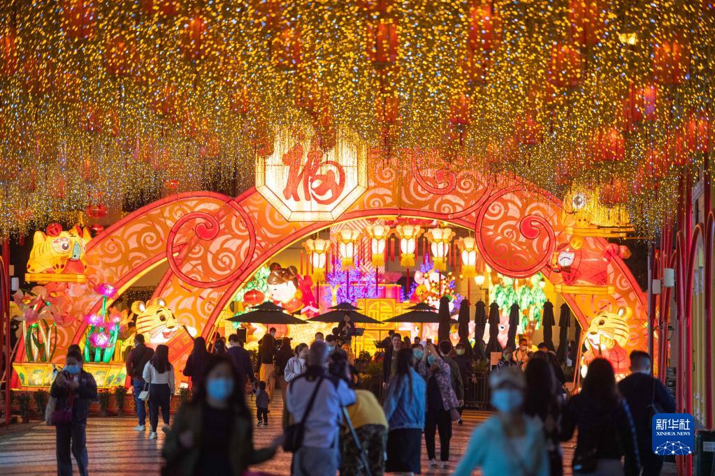 入夜时分,盏盏花灯将小城装点得红彤彤、亮堂堂。市政署在澳门主要街道、广场、公园等60个地点放置富有农历新年气氛的灯饰,灯饰布置以“虎虎生威迎新春”为主题,吸引众多家庭前来观看。