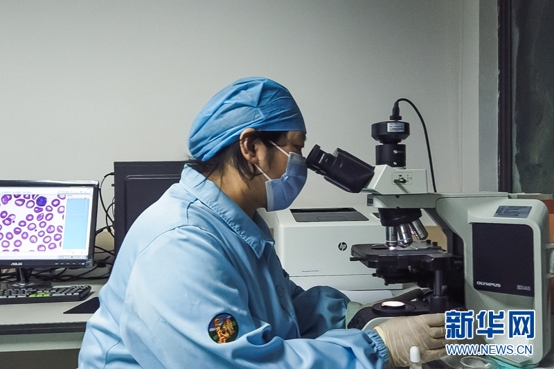 雷妈妈在显微镜下观察血液样本变化。新华网发(张羲轮 摄)新华网 李幸子 文