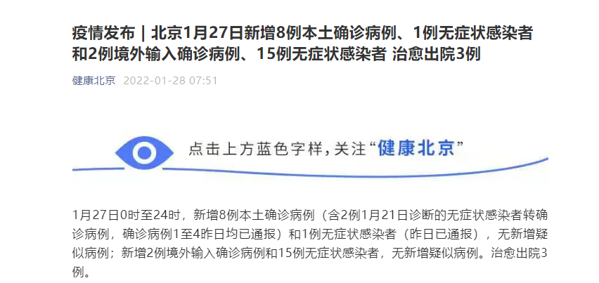 原标题:疫情发布丨北京1月27日新增8例本土确诊病例、1例无症状感染者和2例境外输入确诊病例、15例无症状感染者 治愈出院3例