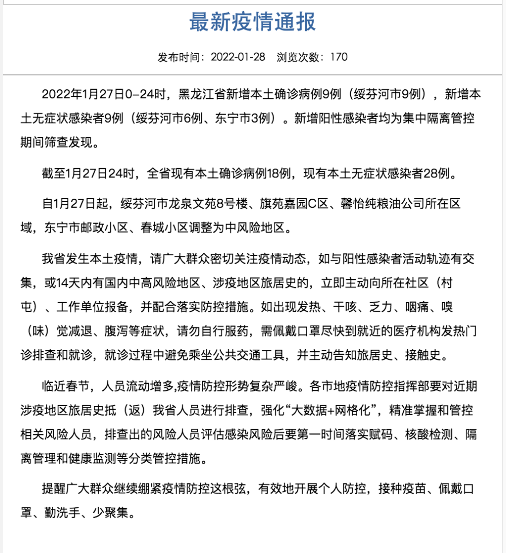 2022年1月27日0-24时,黑龙江省新增本土确诊病例9例(绥芬河市9例),新增本土无症状感染者9例(绥芬河市6例、东宁市3例)。新增阳性感染者均为集中隔离管控期间筛查发现。