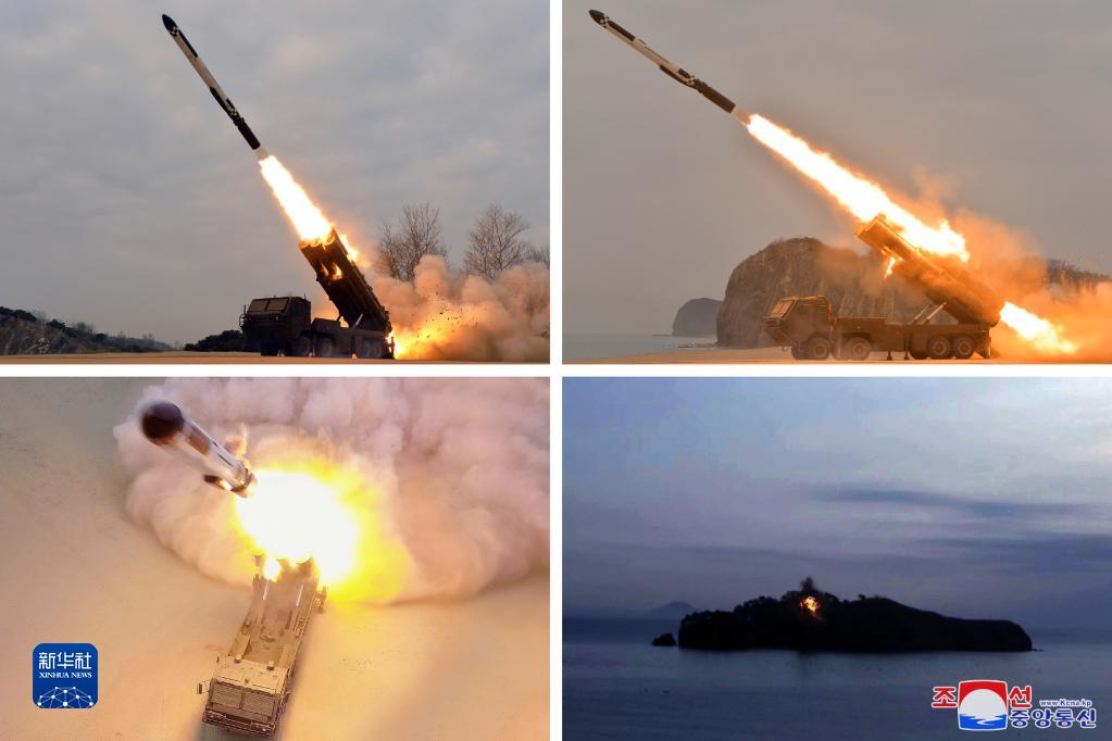朝中社1月28日提供的图片显示,朝鲜国防科学院27日进行的地对地战术导弹试射现场。新华社/朝中社