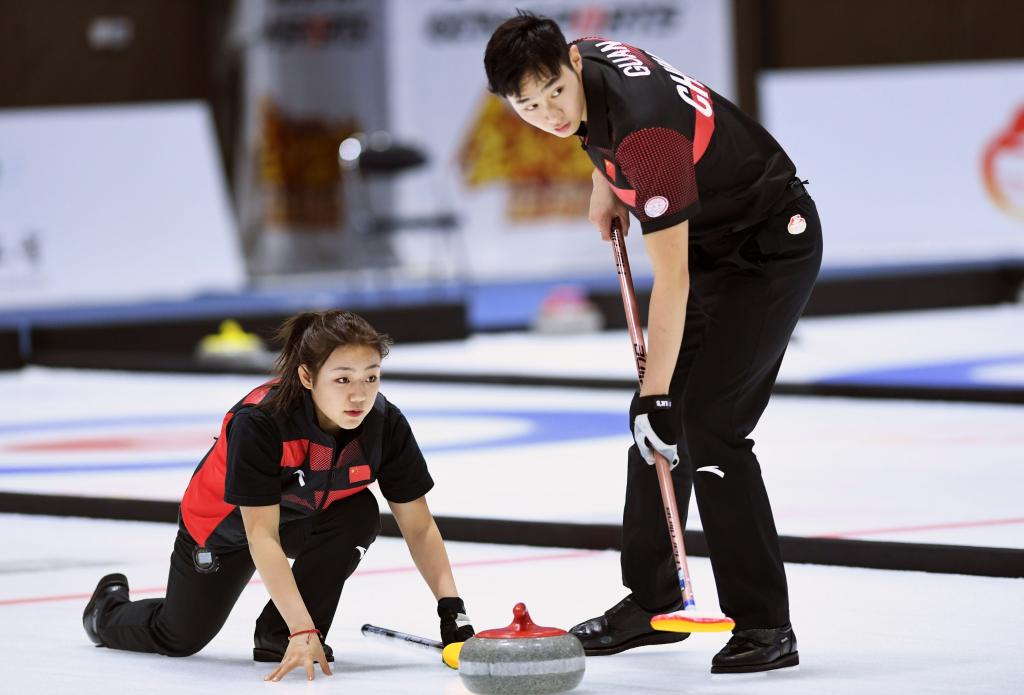 2021年10月6日,冰壶国家集训队队内对抗赛,韩雨(左)/关天琪在第11轮混双比赛中。新华社记者张龙摄