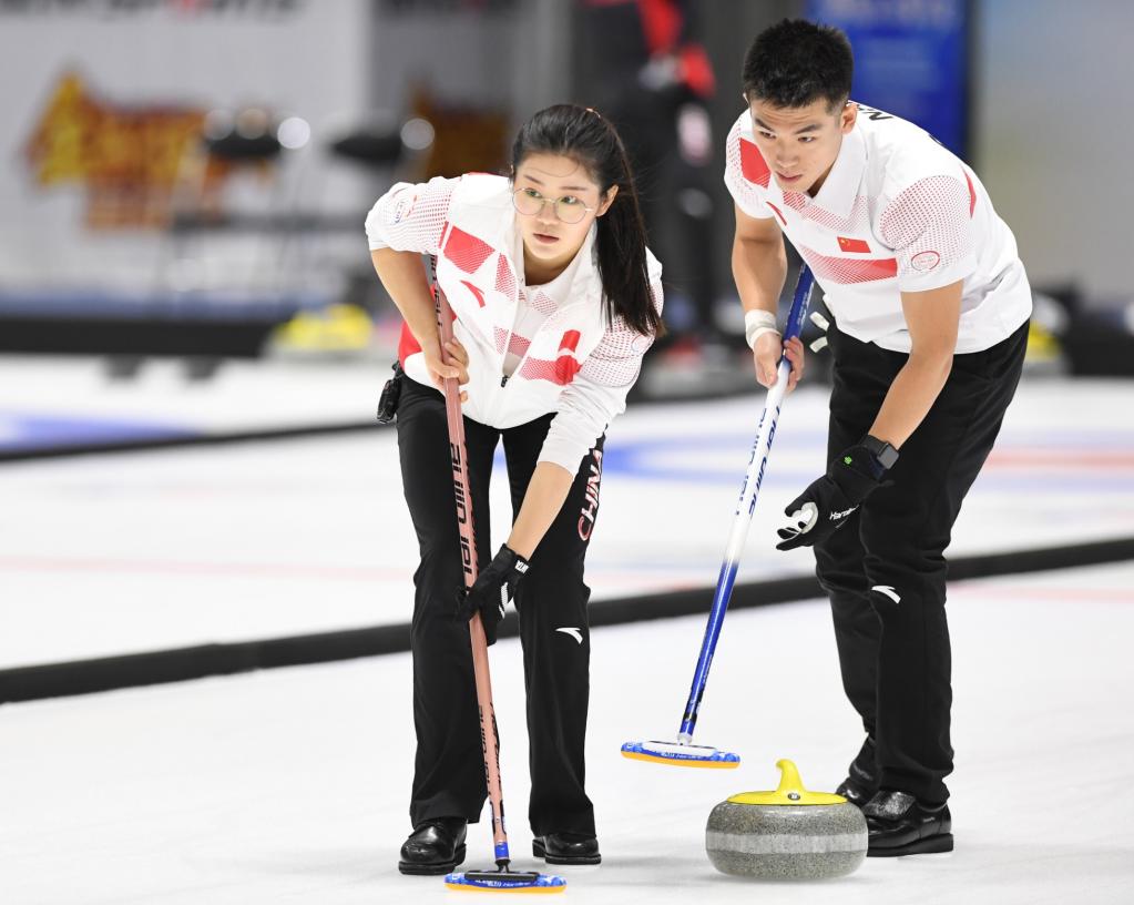 2021年10月6日,冰壶国家集训队队内对抗赛,南佳文(右)/范苏圆在第11轮混双比赛中。新华社记者张龙摄